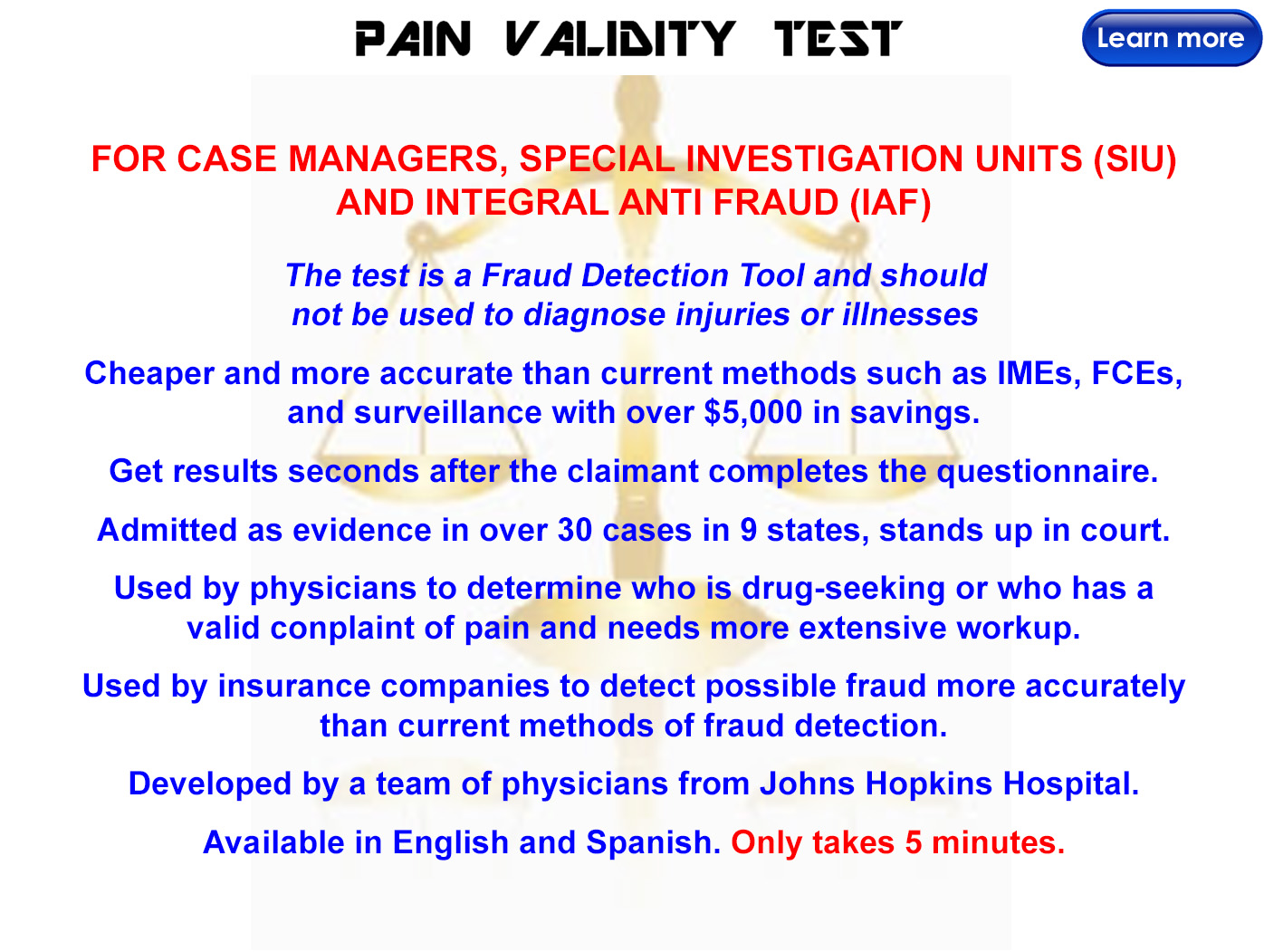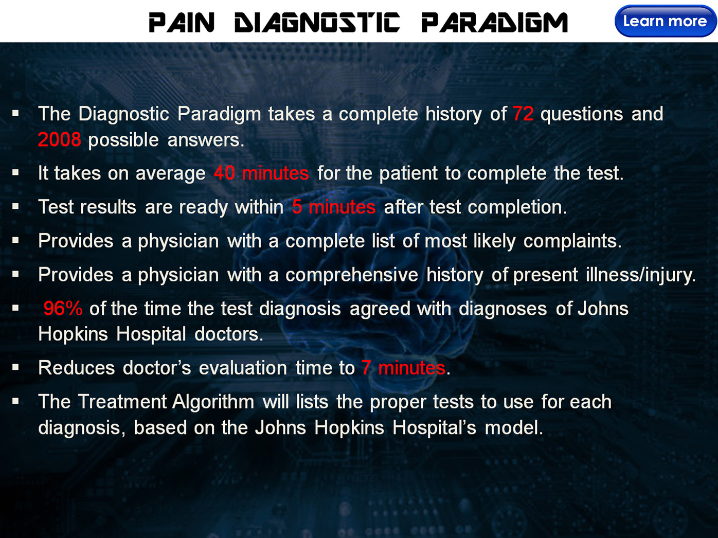 | The tests provided by Artificial Intelligence LABS Pain Solutions are the result of data collection by the doctors at Johns Hopkins Hospital on over 10,000 of their patients over 17 years with millions of dollars in documented savings.