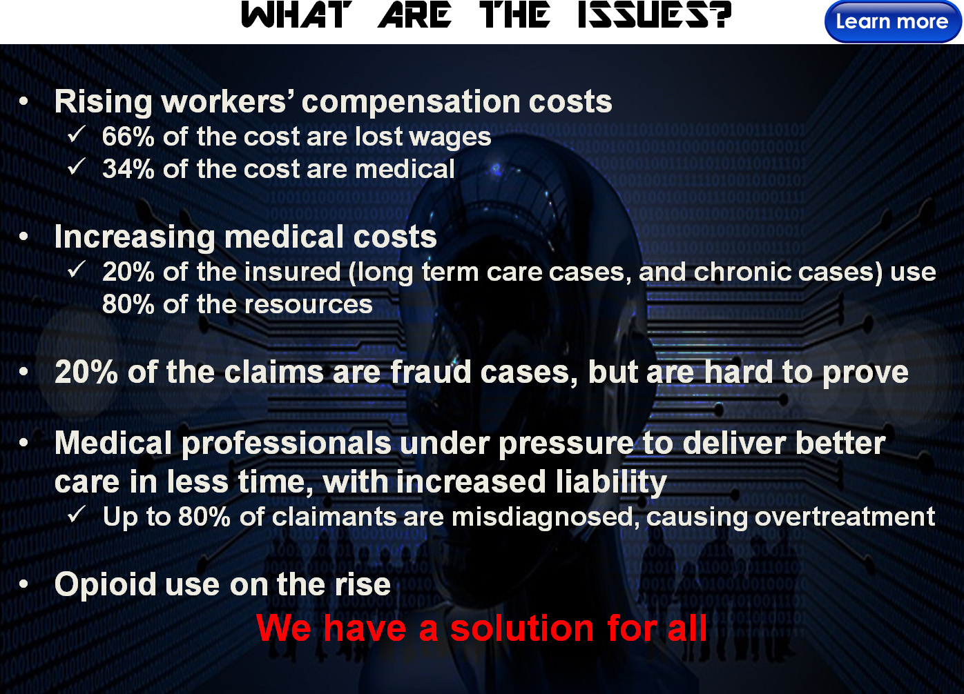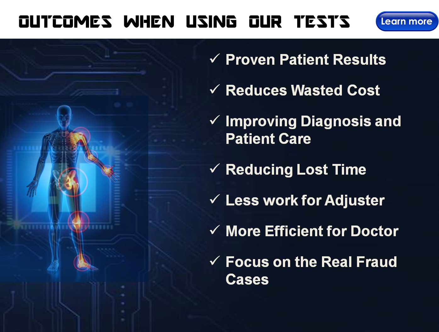 AILABSPS uses Artificial Intelligence algorithms to offer the tests online as a diagnostic tool. Therefore, avoiding the wasteful use of treatments for misdiagnosed injuries that are so typical in as many as 50% of Workers Compensation and Healthcare cases. It takes about 30 to 45 minutes to complete the questionnaire and submit it online. In a few minutes, the Client receives a complete report outlining not just the diagnosis but also the treatments that are likely to provide the best outcomes. |